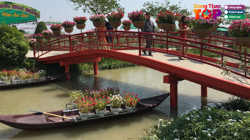 Ngoài tham quan hoa, Cánh Đồng Hoa Hồng Sa Đéc còn gây ấn tượng với hệ thống tiểu cảnh phong phú. Nổi bật có thang vô cực, cánh đồng hoa hướng dương và cầu tre tàng hình. Bến thuyền hoa và dòng sông hoa là góc check-in được yêu thích. Du khách có thể trải nghiệm cảm giác bồng bềnh trên thuyền hoa đầy thú vị. Khu du lịch còn có ao cá phục vụ hoạt động kéo vó truyền thống. Màn biểu diễn cá lóc bay luôn thu hút đông đảo khách tham quan. Ngoài ra, nơi đây còn phục vụ ăn uống và giải khát tiện lợi. Cánh Đồng Hoa Hồng Sa Đéc là điểm dừng chân lý tưởng cho chuyến du xuân và nghỉ ngơi nhẹ nhàng.