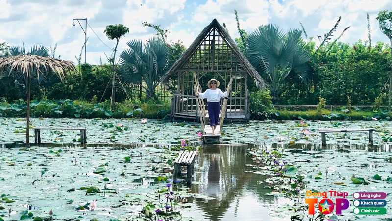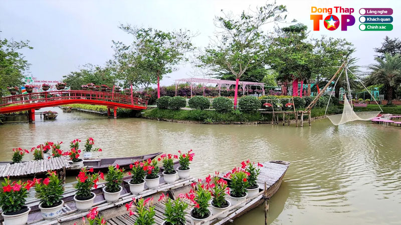 Bên cạnh đó, khu du lịch còn có cầu tre, bến thuyền hoa, nhà lá và vườn tình yêu. Mỗi tiểu cảnh mang một phong cách riêng, phù hợp với nhiều concept chụp ảnh khác nhau. Bạn có thể dễ dàng thay đổi góc chụp mà không lo bị trùng ảnh. Các tiểu cảnh được bố trí hài hòa với không gian hoa, tạo cảm giác gần gũi và tự nhiên. Đây là điểm cộng lớn cho những ai yêu thích chụp ảnh ngoại cảnh.